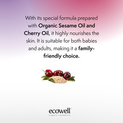 Формулата му създадена с органично сусамово масло и масло от черешови семки е богата на витамини A, D, E и K – силни антиоксиданти, които интензивно хидратират и подхранват бебешката кожа.
