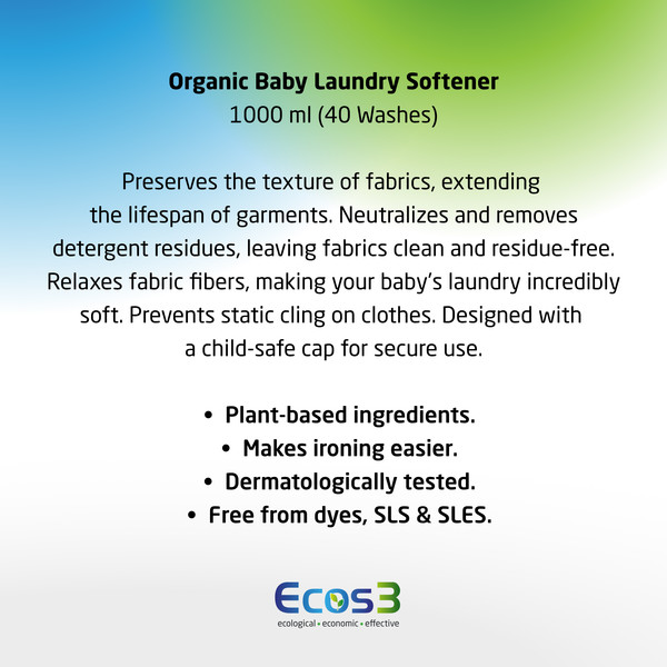 Ecos3 създаде органичен омекотител, който комбинира мекота, защита и устойчивост - без компромис със здравето на вашето дете.